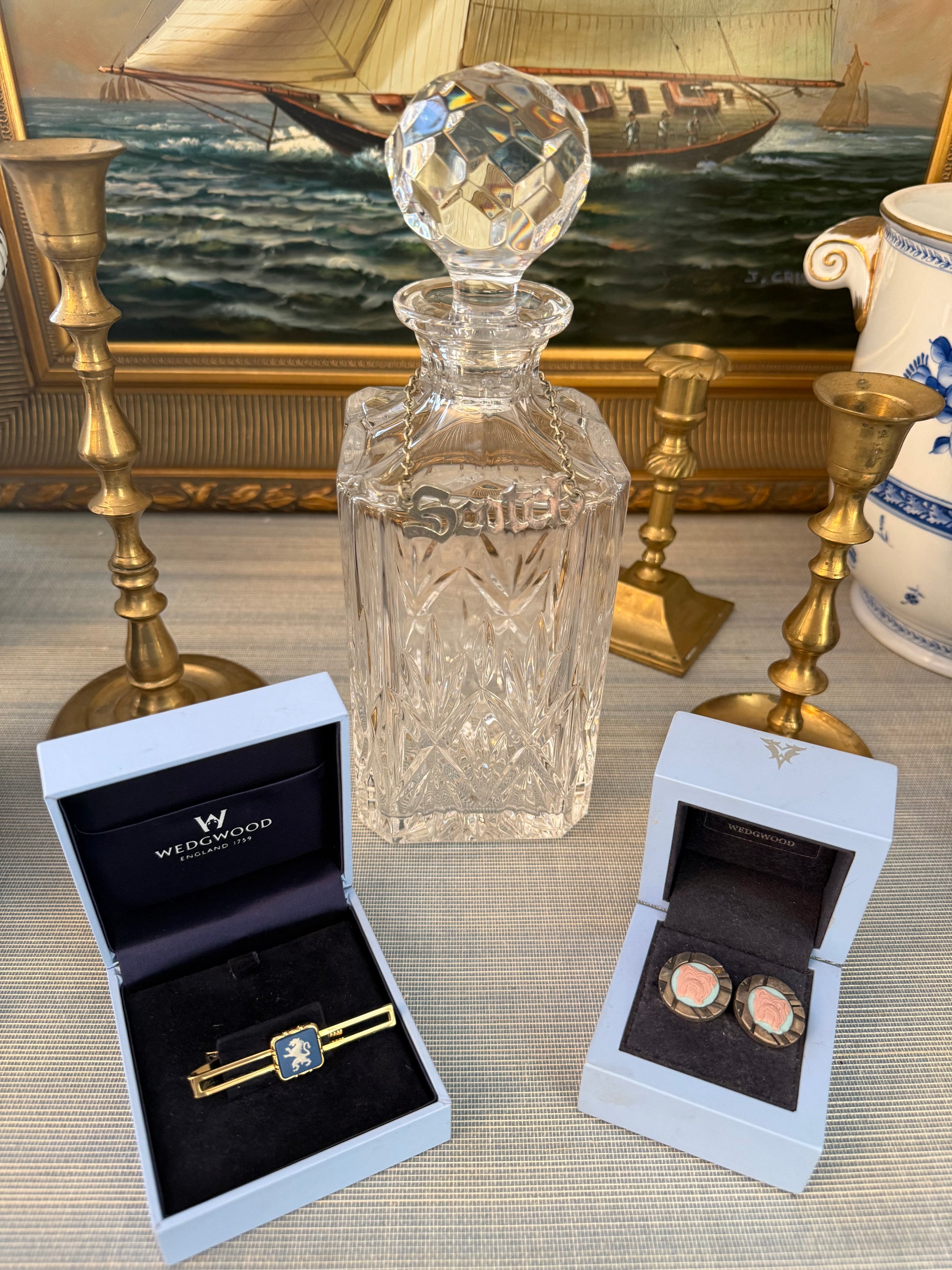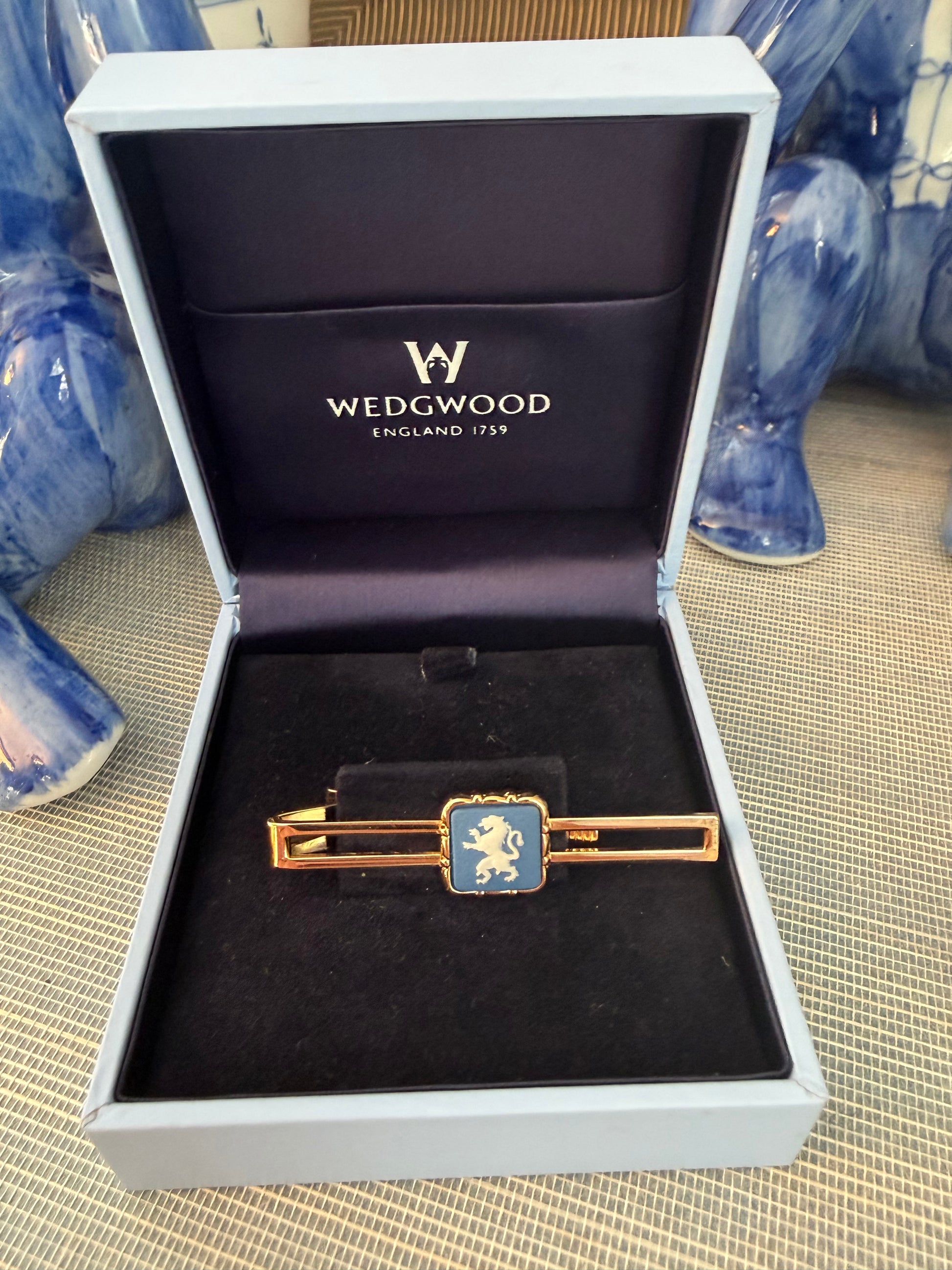 This is a vintage Wedgwood gold-plated blue Jasperware tie clip featuring a lion in the original box. Excellent condition!