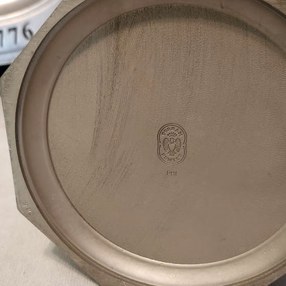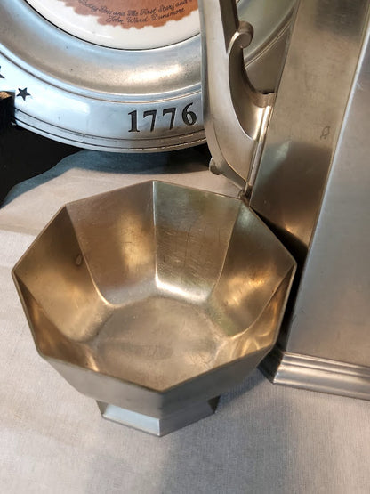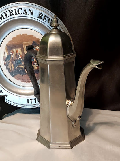 This Vintage Gorham Pewter Coffee Pot with matching Creamer and Sugar in the Octette Pattern is a stunning addition to any kitchen. The beautiful wood handle adds a touch of elegance, while the excellent condition ensures long-lasting use. Make a statement with this vintage set.